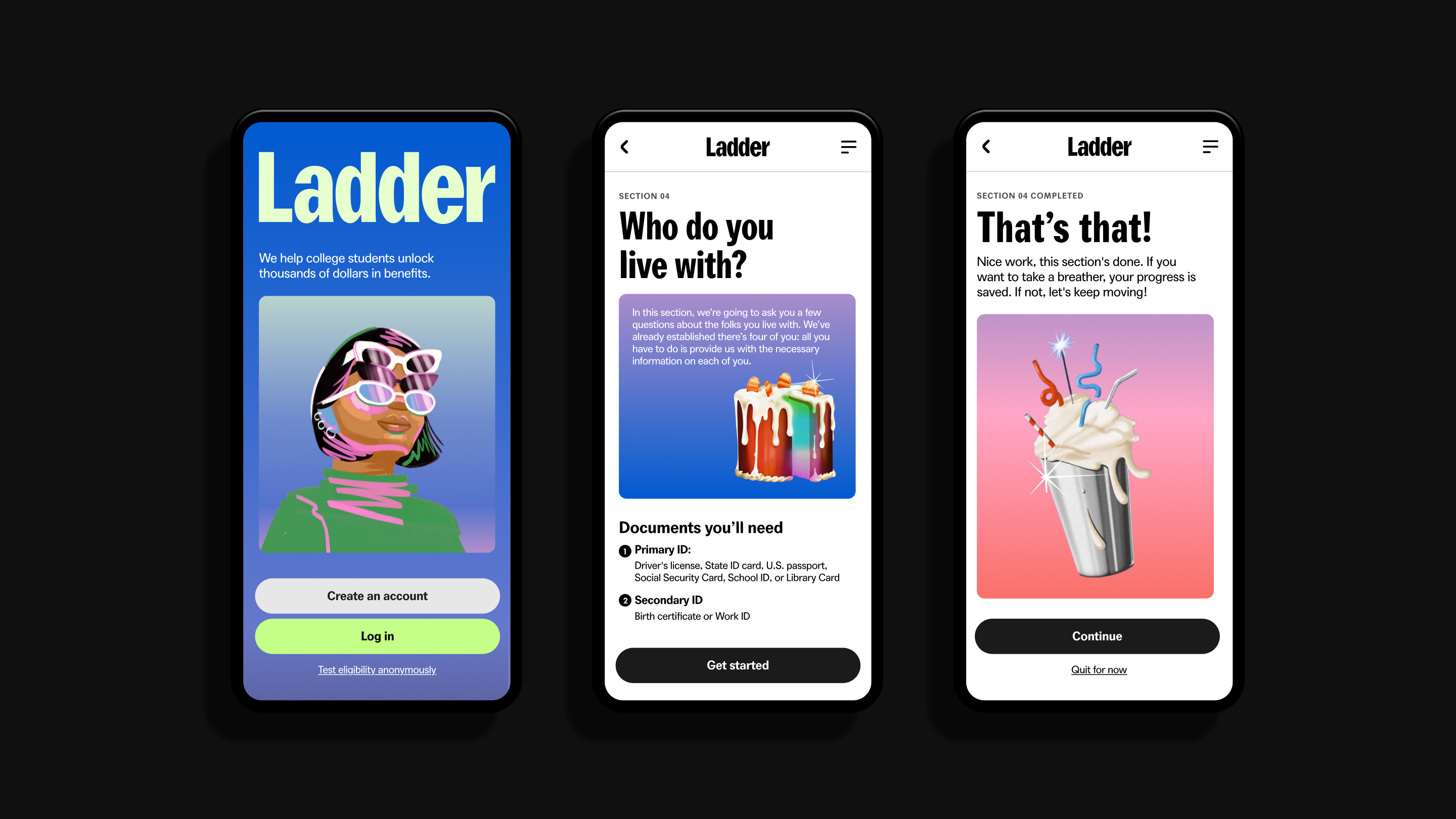 Ladder is a federal assistance program helping students access grocery benefits through SNAP. By translating complex paperwork into a seamless mobile experience, ladder helps low-income individuals and families access nutritious food.
